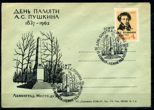 Немаркированный конверт с маркой и СГ. СССР 1962 г. День памяти А.С. Пушкина. КЗ.
