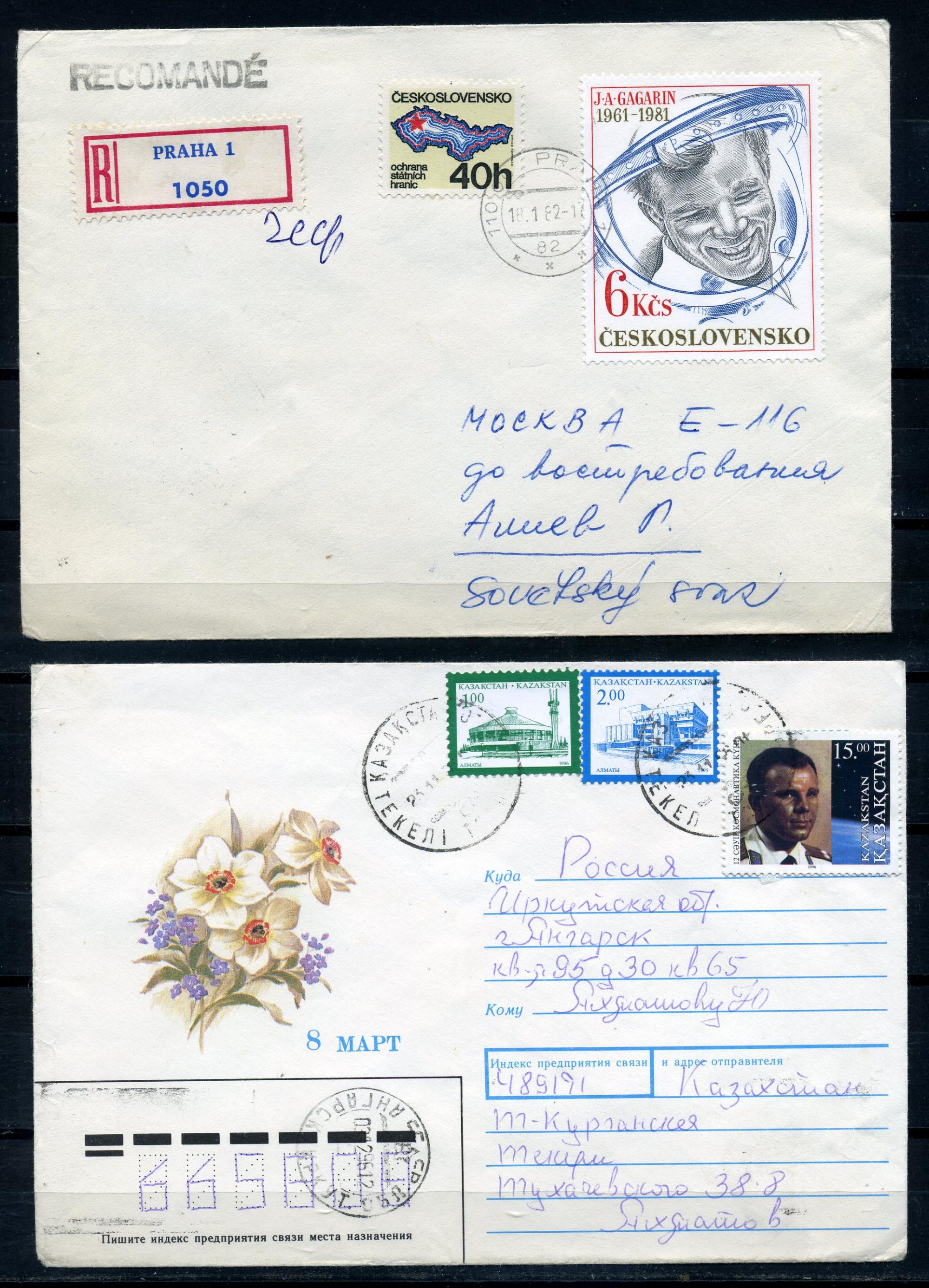 Конверты, прошедшие почту. Чехословакия, Казахстан. Ю.А. Гагарин.