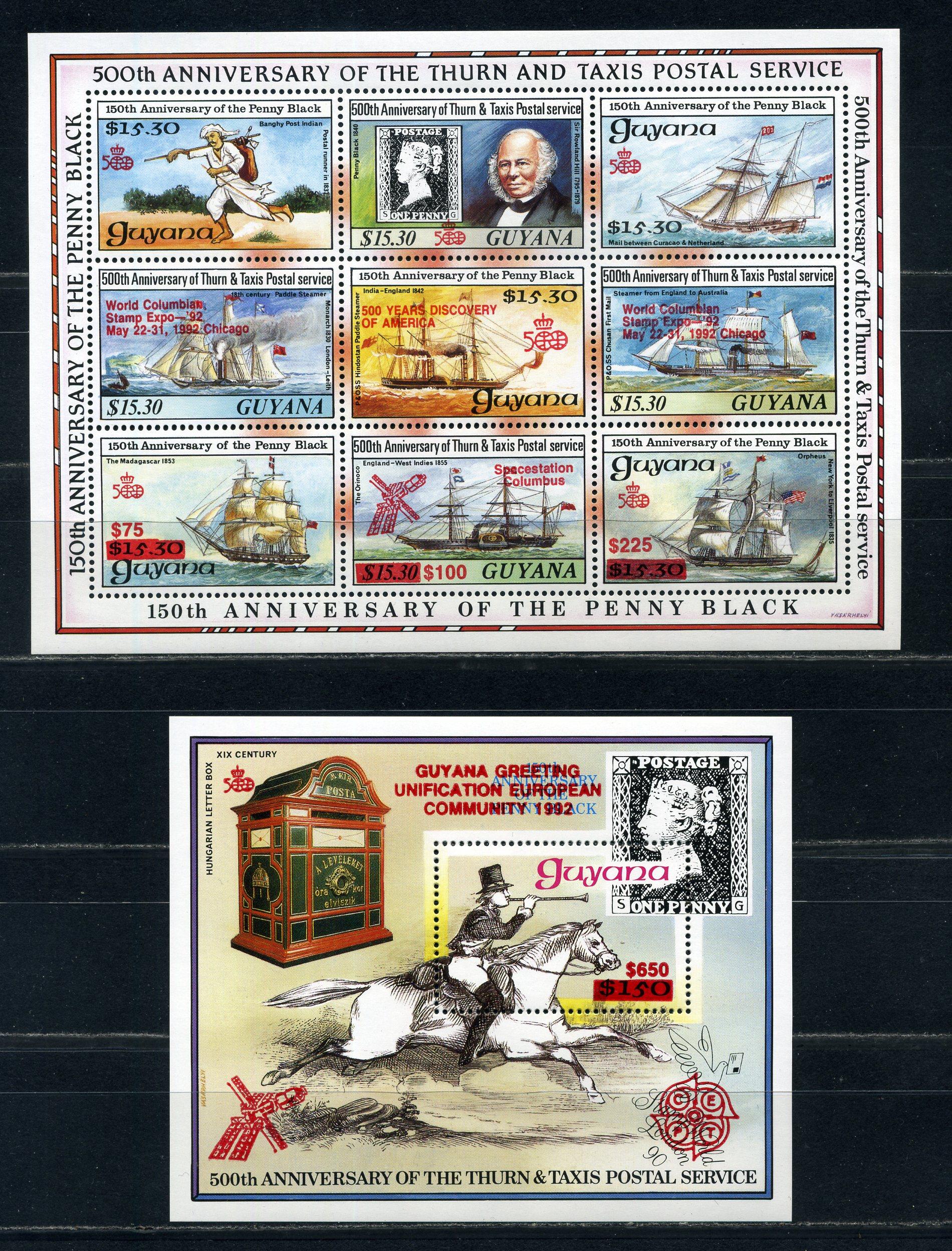 Почтовые марки. Гайана. 1990г. Р.Хилл. Открытие Америки. Надпечатка красная. №3099-3107. Блок №84.