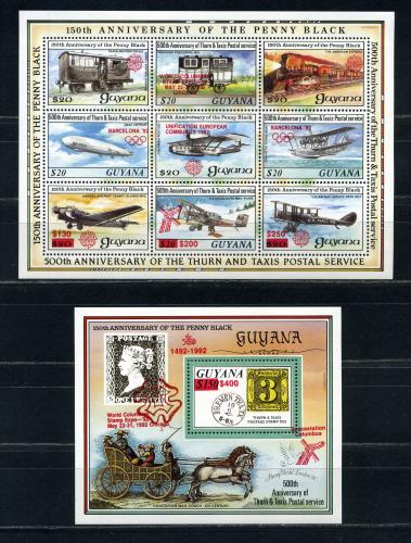 Почтовые марки. Гайана. 1990г. Открытие Америки. Олимпиада. Надпечатка красная. №3135-3143. Блок №86.