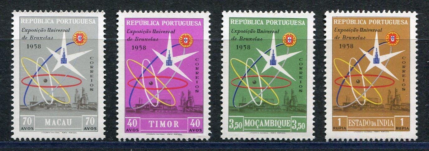 Почтовые марки. Макао-Тимор-Мозамбик. 1958г. Всемир. выставка в Брюсселе. Совм.выпуск. №454,414,534,311.