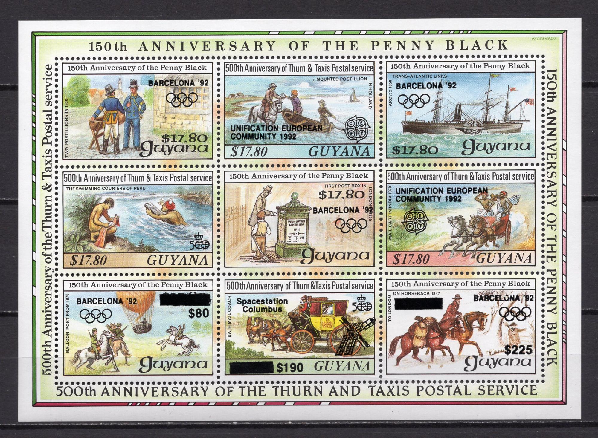 Почтовые марки. Гайана. 1990г. Р.Хилл. Открытие Америки. Олимпиада. Надпечатка. №3126-3134. Блок №85.