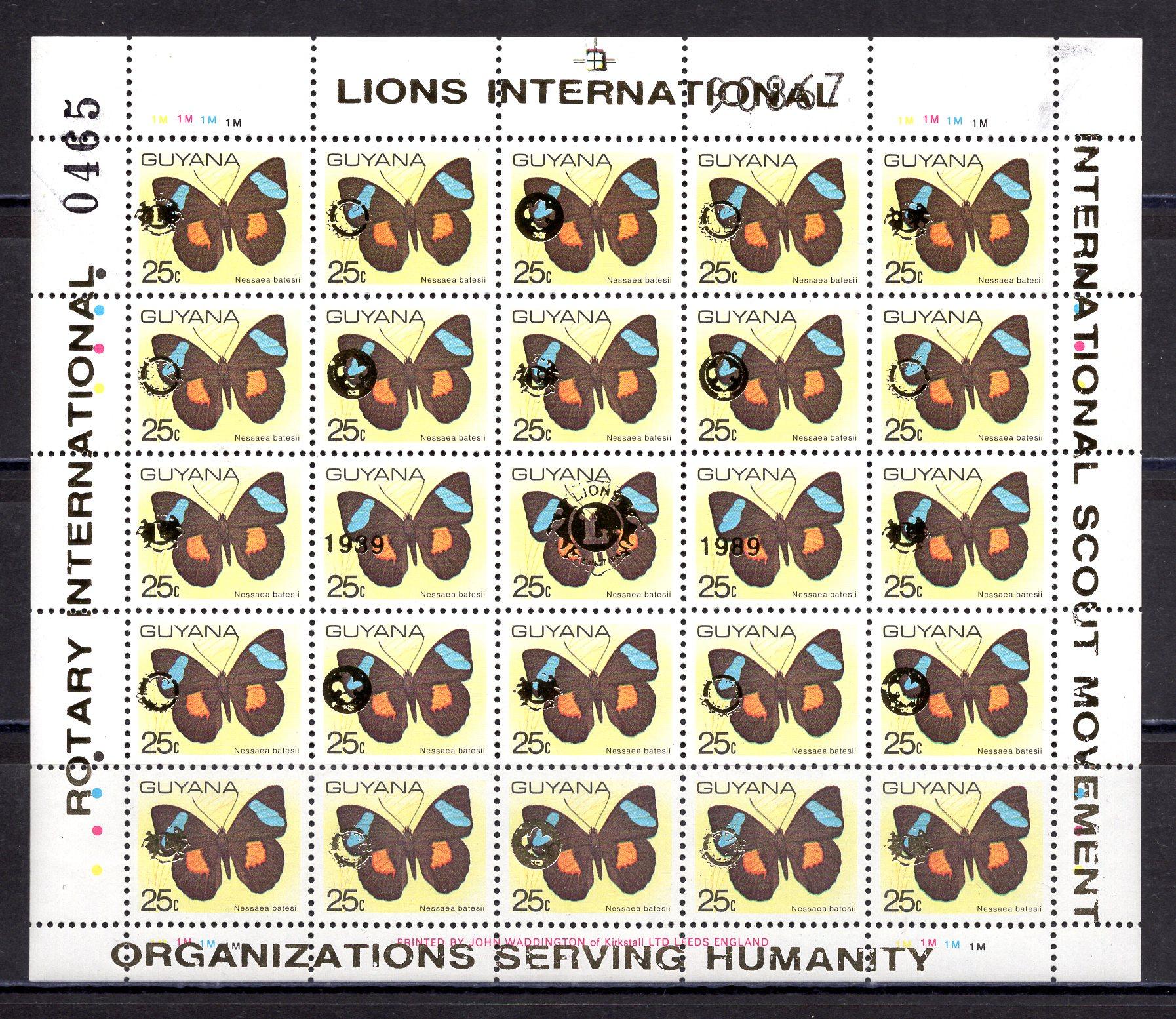 Почтовые марки. Гайана. 1989г. Rotary Int. Бабочки. Надпечатка - золотая. Лионский Клуб. №2617-2621.
