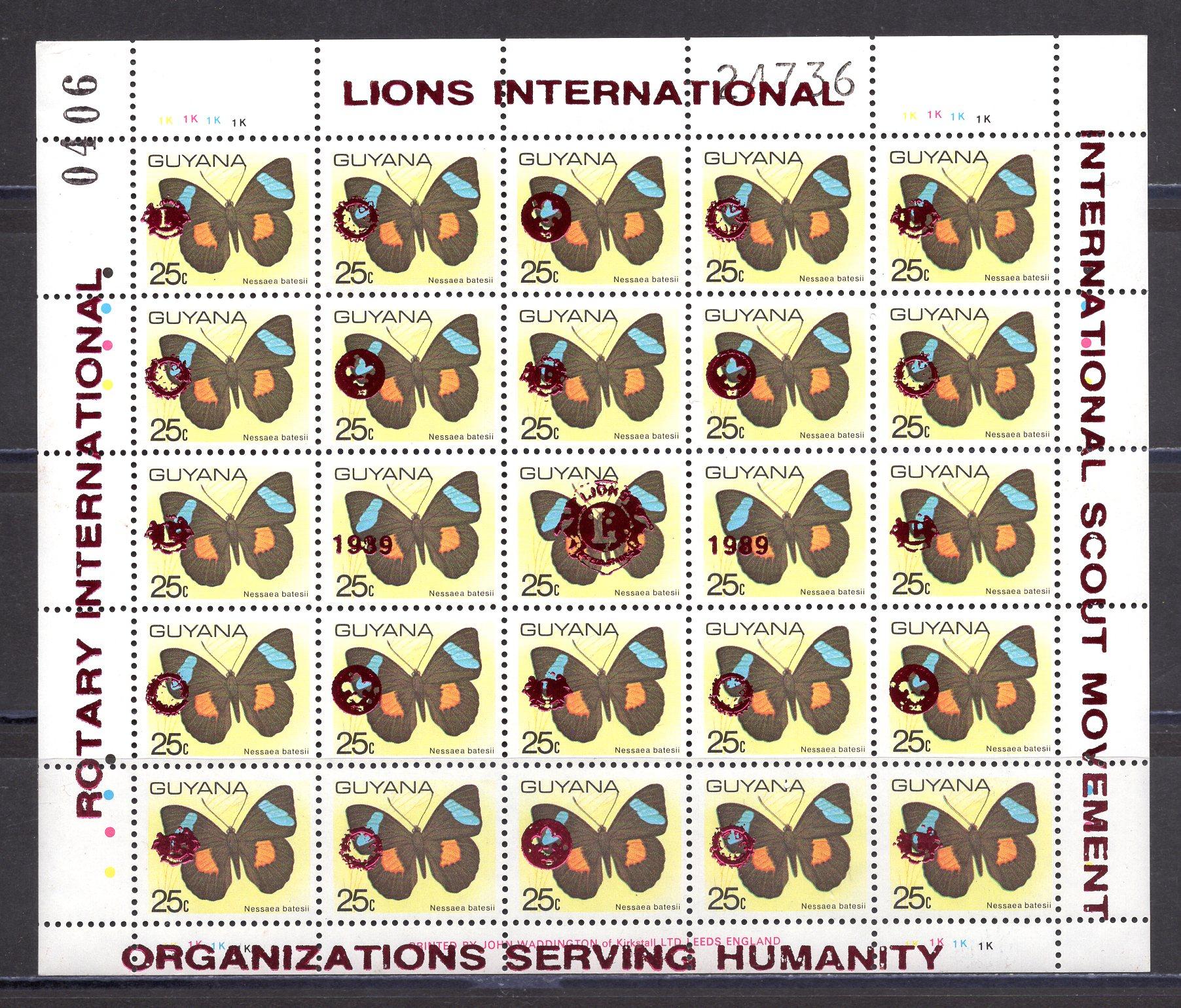 Почтовые марки. Гайана. 1989г. Rotary Int. Бабочки. Надпечатка - красная. Лионский Клуб. №2617-2621.