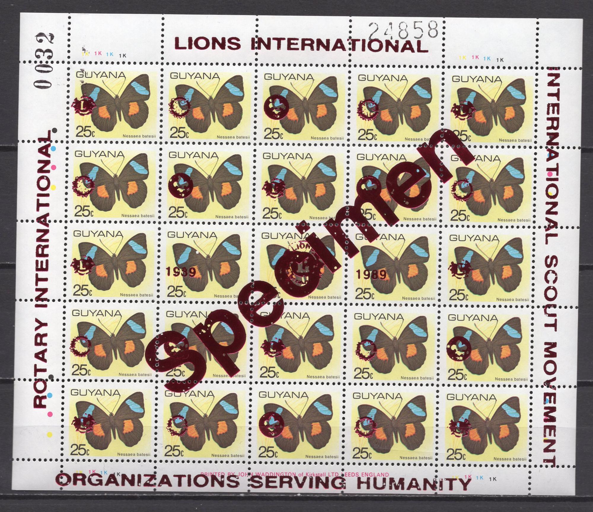 Почтовые марки. Гайана, 1989 г. Лионский клуб. Бабочки. Надпечатка. SPECIMEN. №2617-2621.