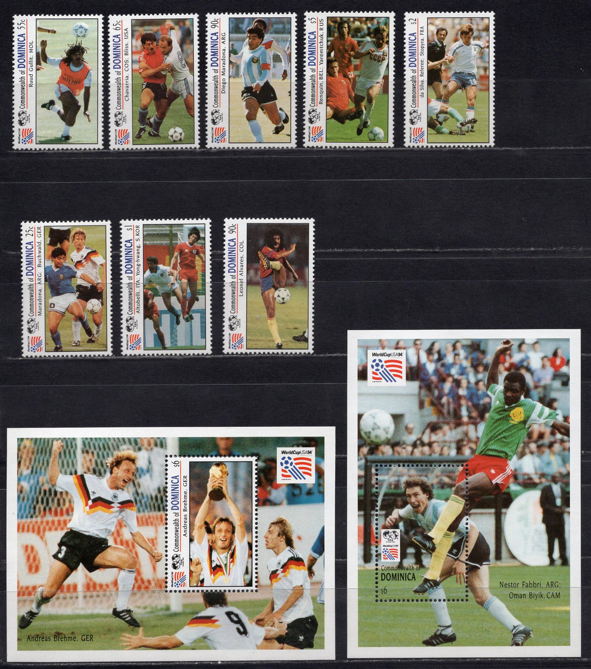 Почтовые марки. О. Доминика, 1993 г. №1732-1739. Бл.247-248. Футбол. (Mi 26.0 e)