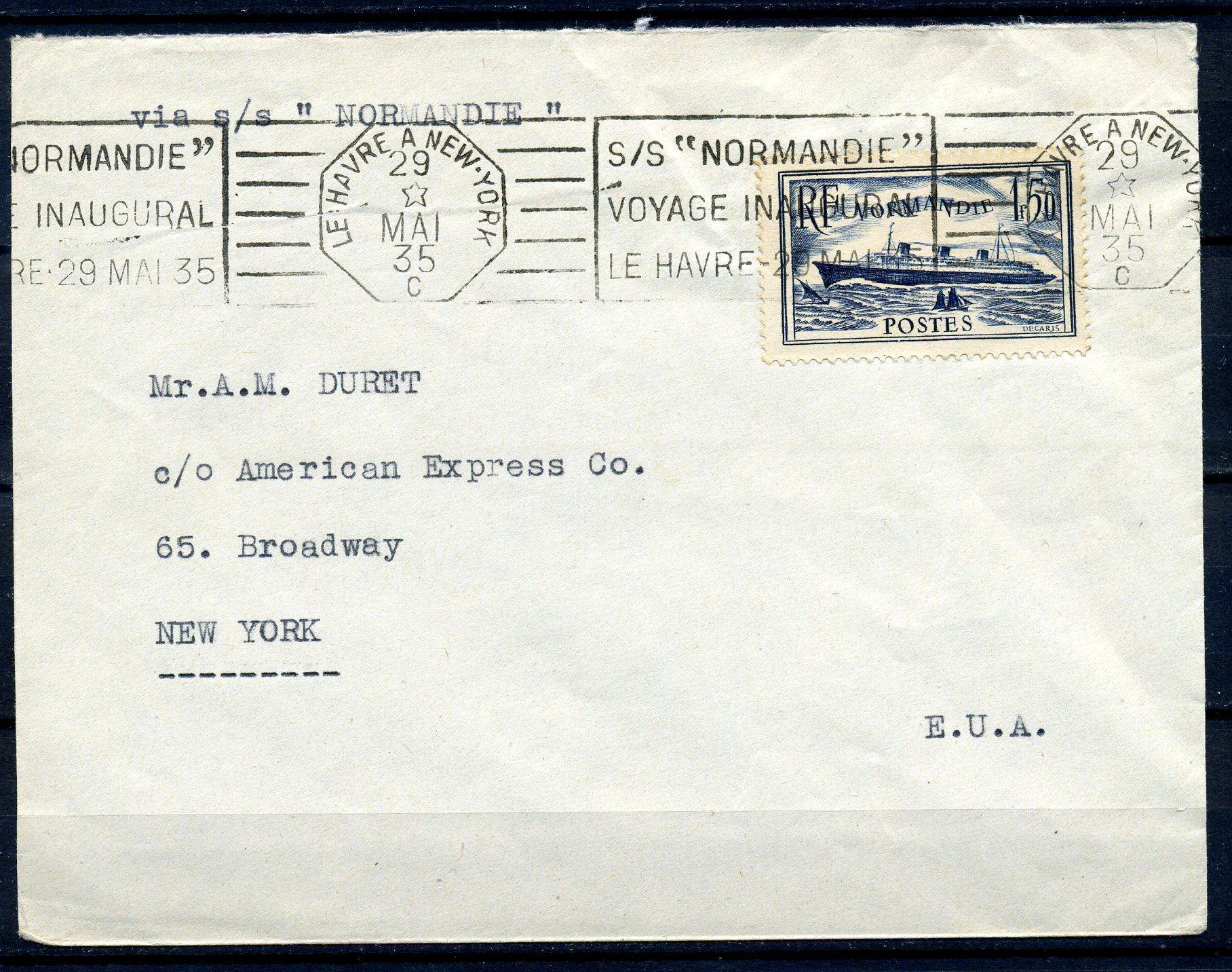 Конверт с маркой и СГ. Франция 1935 г. Лайнер «Нормандия». Первый вояж. КЗ.