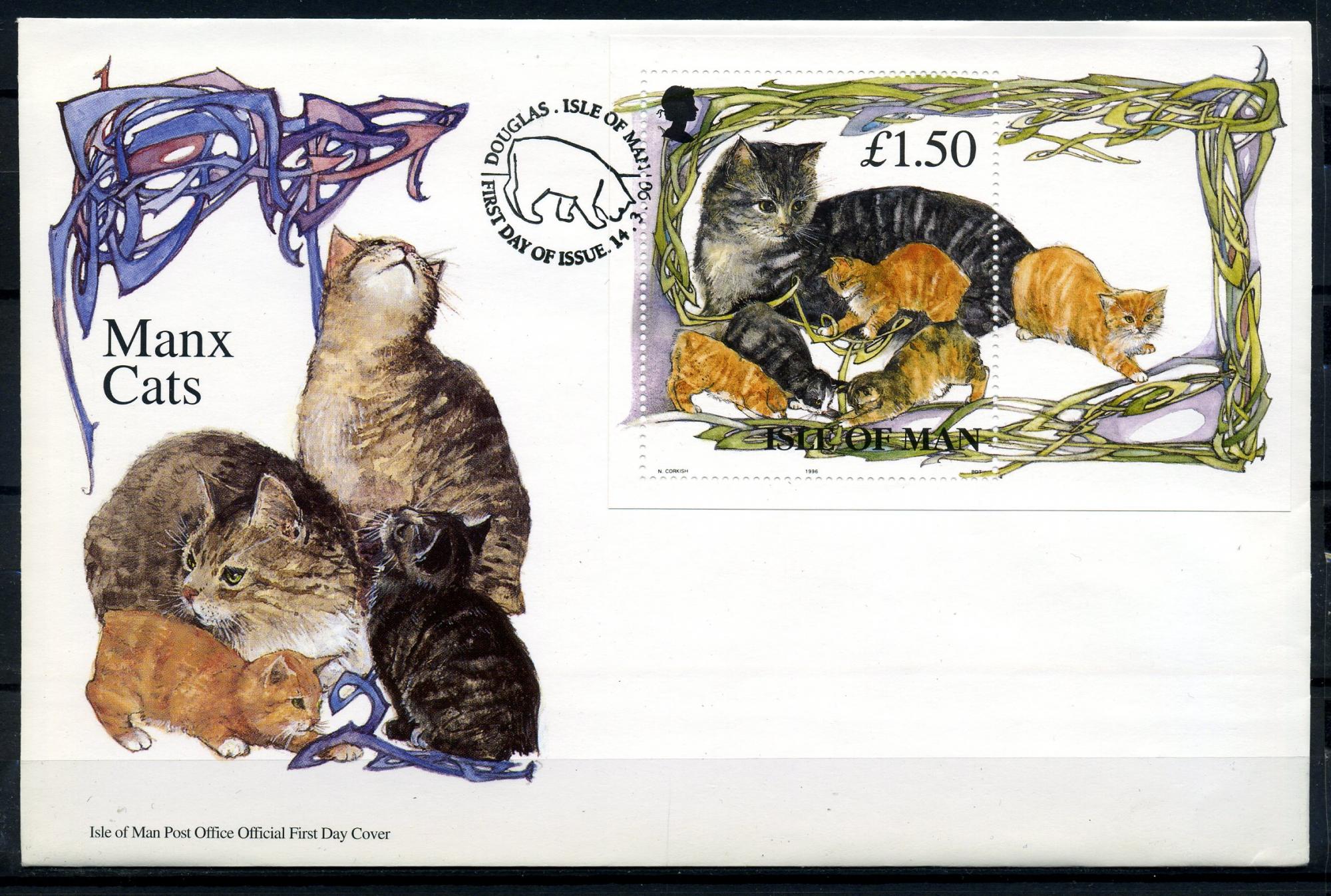Конверт с маркой и СГ. Остров Мэн 1996 г. Кошки.