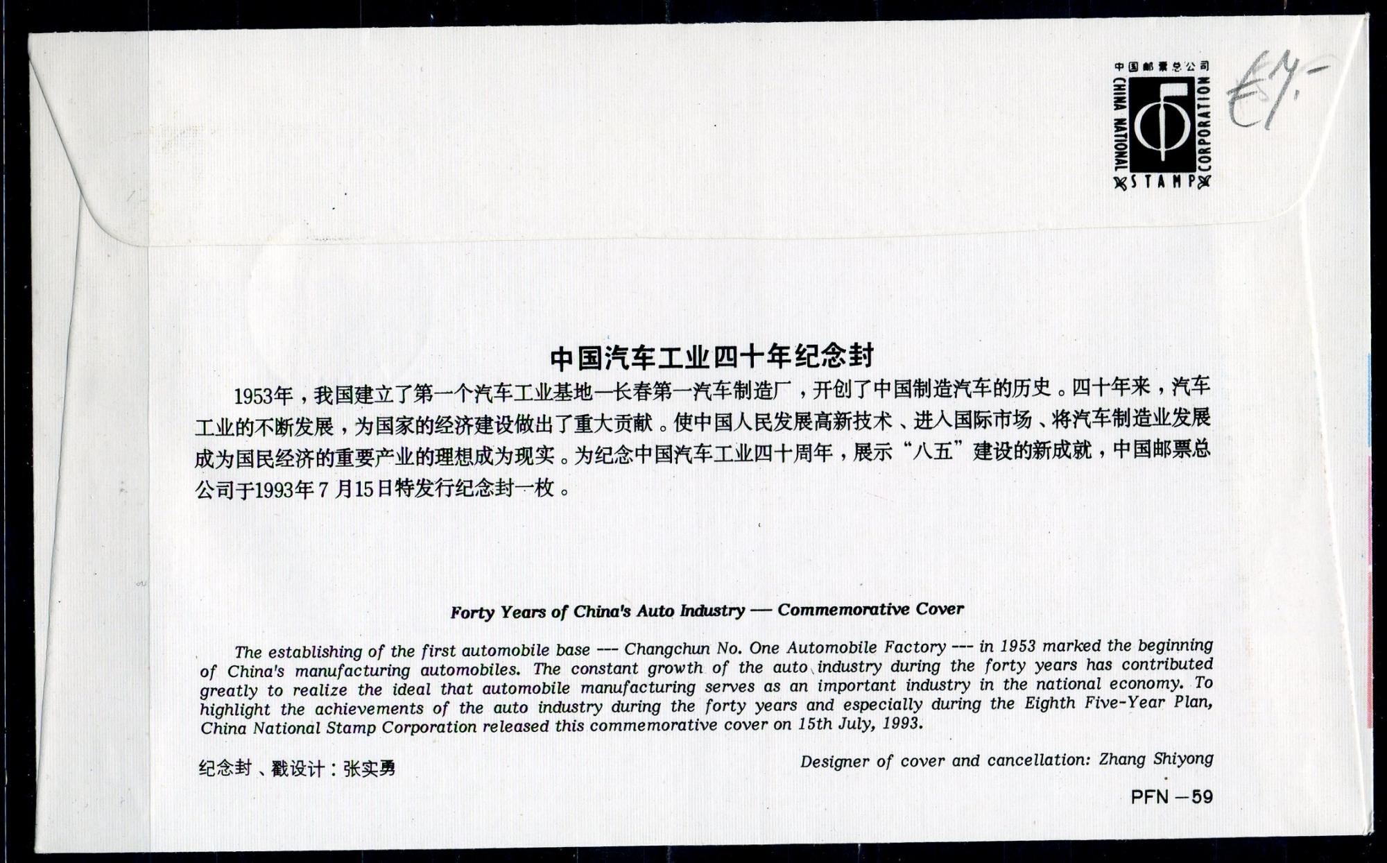 Памятный конверт с маркой и СГ. КНР 1993 г. 40 лет Китайской автомобильной промышленности. Марка 1989 г.