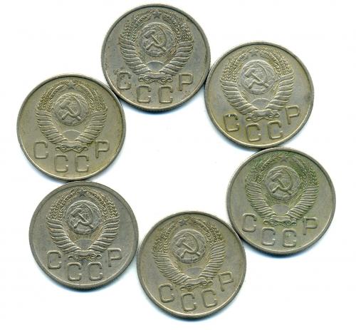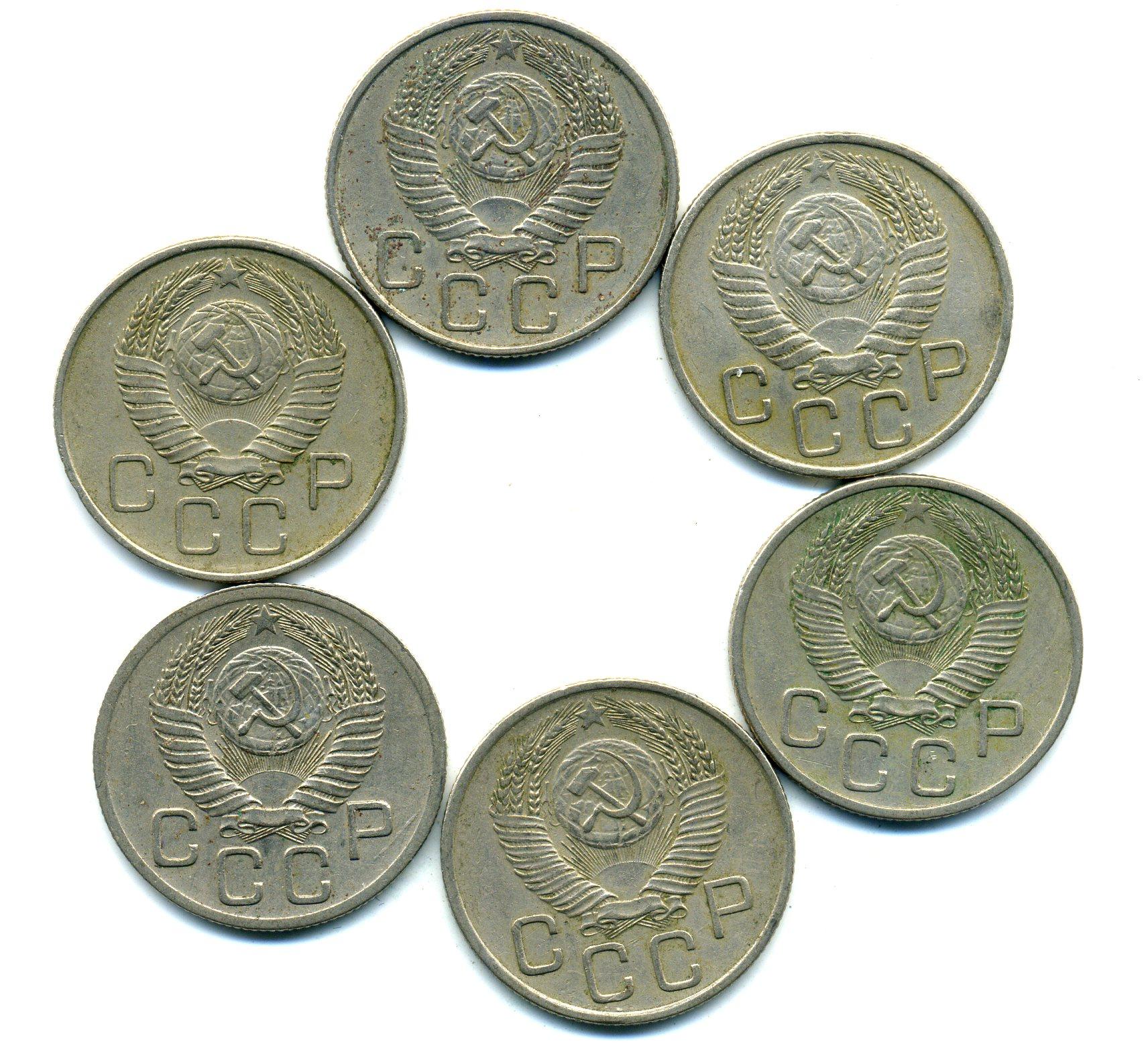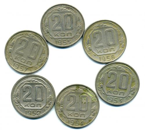 Монеты СССР. 20 копеек 1952-1957 г. 6 шт.
