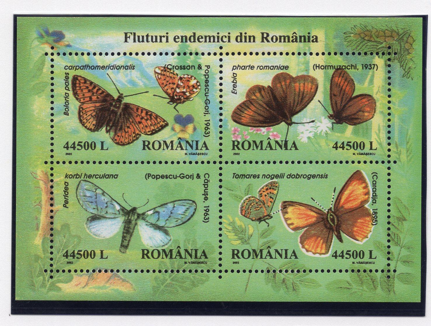 Почтовые марки. Румыния, 2002 г. Бл.322. Бабочки.