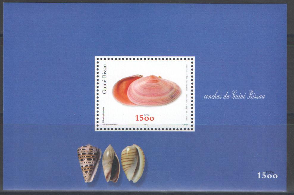 Почтовые марки. Гвинея-Биссау. 2002г. Фауна моря. Ракушки. Блок №379.